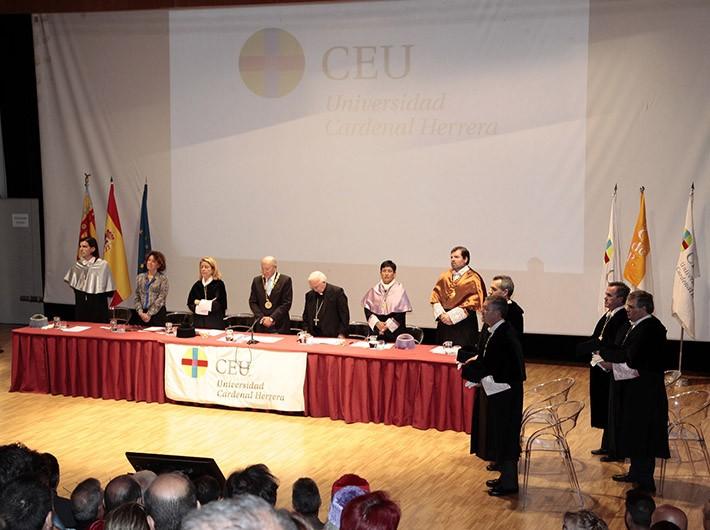 El acto académico ha sido presidido por el Gran Canciller de la Universidad CEU Cardenal Herrera y presidente de la Fundación Universitaria San Pablo-CEU, Carlos Romero, y la rectora de la CEU-UCH. Les acompañaban en la mesa, además de Monseñor Antonio Cañizares, la directora general de Universidad, Investigación y Ciencia de la Generalitat Valenciana, Josefina Bueno; el secretario general de la CEU-UCH, José Manuel Amiguet; la vicerrectora de Alumnado y Extensión Universitaria de la Cardenal Herrera, María José González; y el doctor Ricardo Merí de la Maza, autor de la Lección Inaugural del Curso.