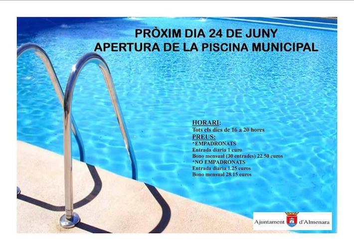 El próximo 24 de junio abrirá sus puertas la piscina municipal de verano de Almenara, ubicada en la zona deportiva y cuyas instalaciones se están terminando de adecuar para la temporada estival. La piscina estará abierta desde el 24 de junio hasta el 4 de septiembre de lunes a domingo en horario de 4 a 8 de la tarde para el baño libre.Los bonos e inscripciones para los diversos cursillos programados se pueden adquirir ya en el Molí d’Arròs. De hecho en apenas una semana ya son cerca de 200 las personas que se han apuntado a las actividades de la piscina municipal para el verano. Destacar que el baño libre para los empadronados en Almenara costará un euro y el bono mensual de 30 días, tendrá un coste de 22,50 euros. Para los no empadronados en Almenara, la entrada diaria será de 1,25 euros, mientras que el bono mensual se situa en 28,15 euros.