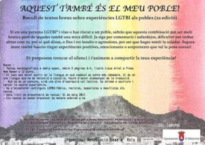 L’Associació Sexe n’rols i l'Ajuntament d'Almenara realitzaran en breu la segona edició del llibre de relats 'Aquest també és el meu poble!' consistent en un recopilatori de relats o textos breus sobre experiències LGTBI (lesbianes, gais, transexuals, bisexuals, intersexuals) especialment en els pobles amb la proposta que es “trenque el silenci” animant a compartir aquesta experiència, doncs es pretén “visibilitzar el que no es veu” i traure a la llum la situació del col·lectiu LGTBI a través d'aquests relats i crear un llibre perquè tothom puga llegir-los en trencar-se el silenci. Les persones interessades poden enviar els seus relats fins al 31 de maig, bé amb el seu nom, bé de forma anònima.