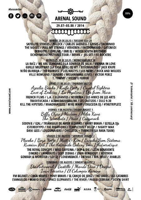 Más de 120 artistas se darán cita en la Playa de El Arenal en Burriana para celebrar los cinco años del festival, que se ha convertido en una de las fechas imprescindibles del verano. Azealia Banks, Biffy Clyro, Placebo, Die Antwoord, Crystal Fighters, Bastille, Mando Diao, Love of Lesbian o Russian Red, entre otros, encabezarán una edición de lujo.