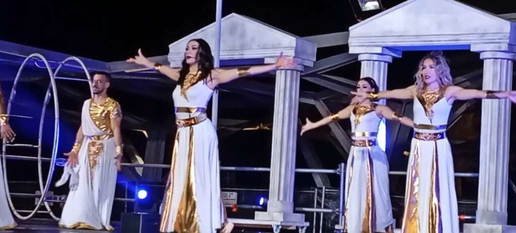 El cielo de Vinaròs se ha iluminado con luces y colores mientras Carnestoltes descendía con majestuosidad desde la antigua Grecia, ofreciendo a los presentes una experiencia única y novedosa.