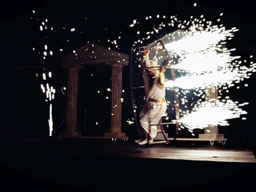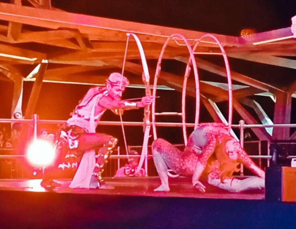 Con el espectáculo aéreo Mythology, de la compañía italiana Stardust Company, arrancaba el acto de llegada del rey carnal en la zona de la pérgola del tramo Colón del paseo marítimo donde se han concentrado cientos de carnavaleros.