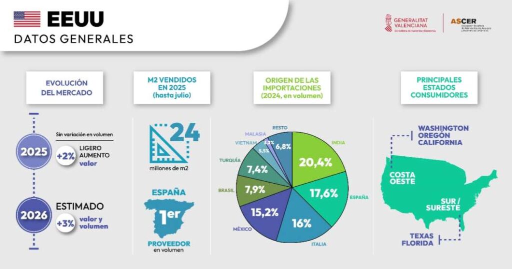 Según se desprende del estudio, el mercado estadounidense de baldosas cerámicas supuso en 2024 unas ventas de cerca de 32 millones m2, siendo la cuota de España del 17,6% y ocupando la segunda posición por detrás de India. Sin embargo, con datos de 2025 hasta julio, España se ha convertido en el primer proveedor en volumen del mercado.