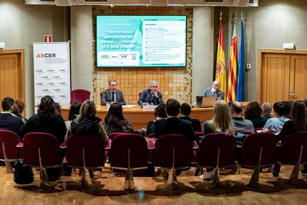 La sede de Ascer ha acogido hoy la presentación de tres proyectos sectoriales enfocados en el área técnica, en concreto en materia de circularidad, adaptación del sector al cambio climático y de comportamiento frente al fuego y eficiencia energética de la fachada del edificio. Los estudios han estado elaborados por expertos bajo la supervisión del equipo técnico de Ascer y se encuadran en el marco del convenio suscrito con la conselleria de Hacienda y Economía de la Generalitat Valenciana. Han inaugurado la jornada, el vicepresidente de Ascer, Ismael García Peris; el Secretario Autonómico de Medio Ambiente y Territorio de la Generalitat Valenciana, Raúl Mérida; y el Secretario General de Ascer, Alberto Echavarría.