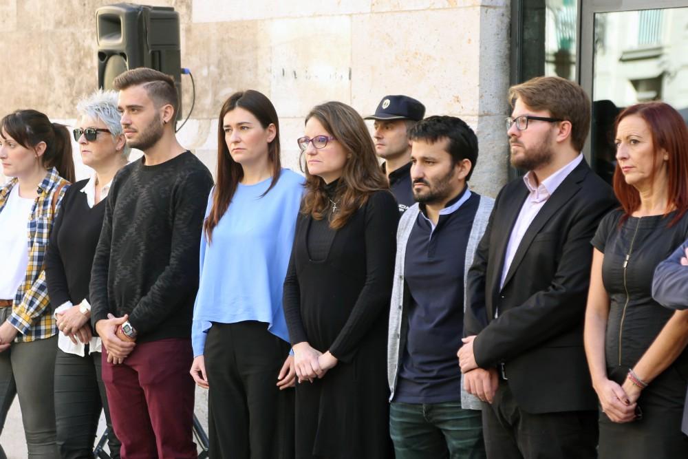 La vicepresidenta, junto con otros miembros del Gobierno valenciano y representantes de los diferentes grupos políticos, ha guardado tres minutos de silencio frente al Palau de la Generalitat.