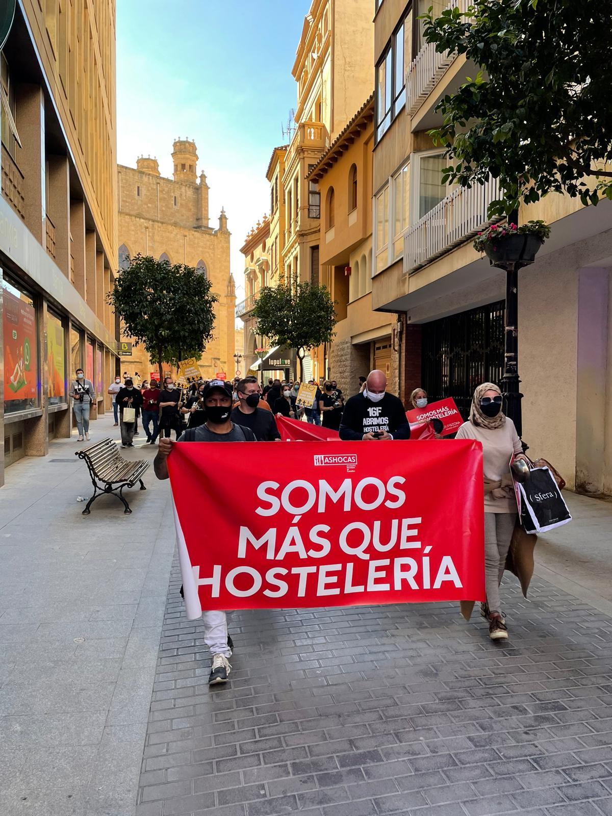 Tras guardar un minuto de silencio por los empresarios víctimas de la Covid "que se han quitado la vida porque no podían aguantar más esta situación", los hosteleros han vuelto a activar el mensaje de sus cacerolas y han iniciado la marcha por la plaza de la Hierba y la calle Caballeros hasta la plaza de las Aulas, frente a la Diputación Provincial.