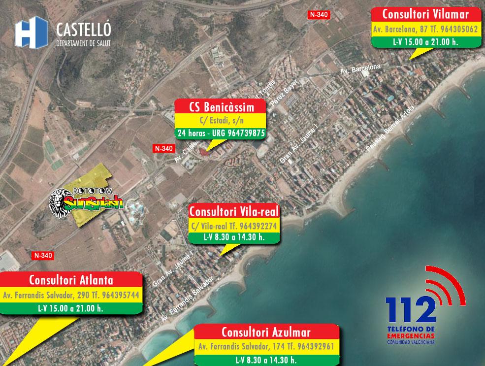 Los residentes, asistentes al festival Rototom 2018, y el resto de turistas que se encuentren en Benicàssim, tienen a su disposición durante la época estival, además del Centro de Salud, los distintos consultorios auxiliares de temporada ubicados en el municipio: Atlanta, Azulmar, calle Vila-real y Vilamar.