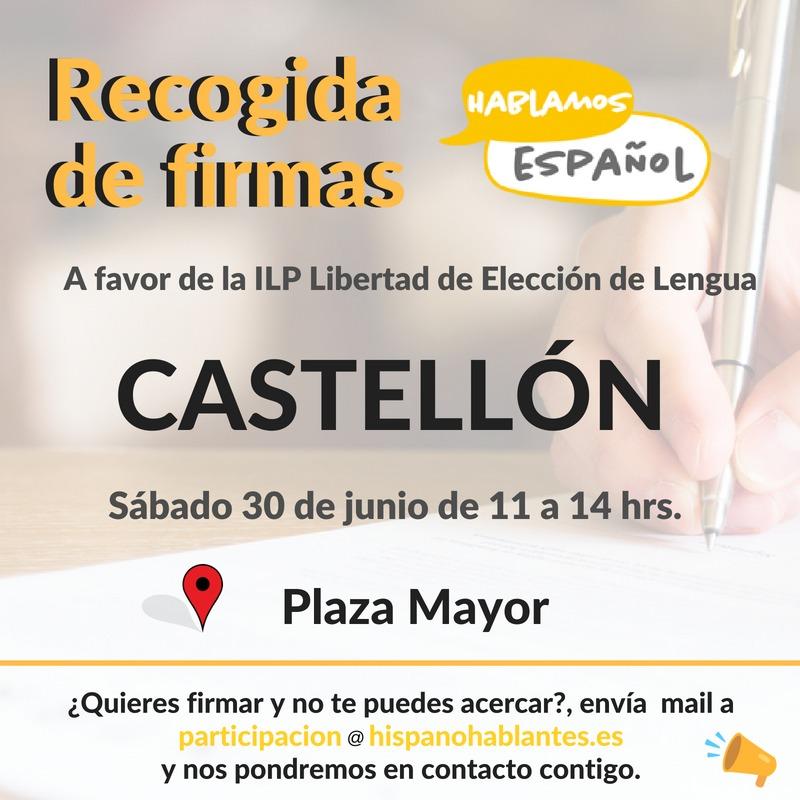 Con el visto bueno de la Mesa del Congreso, la asociación inició la recogida de firmas en el mes de noviembre. Se necesita alcanzar las 500.000 firmas para que la Iniciativa Legislativa Popular (ILP) de Libertad de Elección Lingüística se debata en Las Cortes. Tras los excelentes resultados obtenidos en todas las ciudades Hablamos Español ha organizado una recogida de firmas en Castellón el sábado, 30 de junio. Se instalará la mesa en la Plaza Mayor, y allí se recogerán firmas y se ofrecerá información desde las 11 hasta las 14 horas.