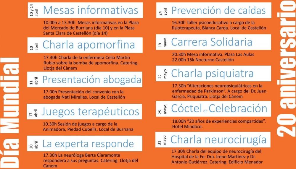 El próximo martes día 10 de abril arrancan las actividades organizadas con motivo del Día Mundial y del XX Aniversario, con la ubicación de puntos informativos en la plaza de la Mercé de Burriana (mañana del día 10 de abril) y en la plaza Santa Clara de Castellón (mañana del 14 de abril), seguidos de otros muchos eventos informativos planificados durante los meses de abril y mayo.