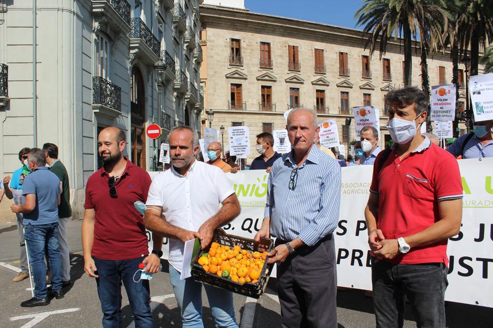 Centenares de agricultores convocados por La Unió de Llauradors y la Asociación Valenciana de Agricultores han reclamado hoy en Valencia, a las puertas de la Delegación del Gobierno, la autorización de herramientas de lucha eficaces y el pago de compensaciones por los daños ocasionados por la plaga del Cotonet de Sudáfrica, cuyas pérdidas durante la próxima campaña citrícola superarán los 120 millones de euros en la Comunitat Valenciana (6 millones por el coste de los tratamientos y 114 millones por los perjuicios directos sobre la fruta).