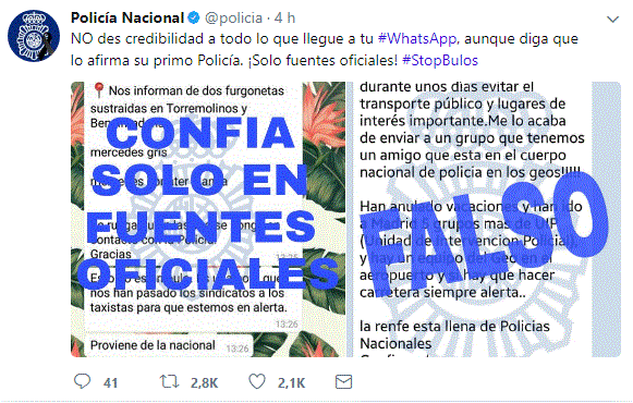 Además aconsejan a los ciudadanos que consulten, solamente, las fuerte oficiales como puede ser el propio canal de Twitter de la Policía Nacional para informarse sobre este tipo de cuestiones de seguridad nacional. Asimismo recomiendan que no se compartan estas cadenas de falsos mensajes con el fin de reducir el impacto que puede producir sobre ciertas personas que no conozcan el uso de este tipo de contenido viral.