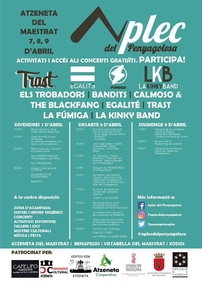 Aplec PenyagolosaLa primera edición del Aplec del Penyagolosa se celebra en Atzeneta del Maestrat los días 7, 8 y 9 de abril. Tanto la localidad como Benafigos, Vistabella del Maestrat y Xodos participan en este encuentro festivo, cultural, lúdico y gratuito que comienza el viernes por la tarde con la inauguración a las 17 horas en la zona de las instalaciones deportivas.