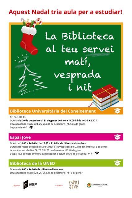 Con una capacidad para poder acoger hasta 150 plazas de estudio, el horario de este centro bibliotecario será de 08.00 a 14.00 horas y de 16.30 horas a 2.30 horas de la madrugada, de lunes a domingo, exceptuando los días 24,25 26 y 31 de diciembre y los días 1,5 y 6 de enero. El Espai Jove abrirá un aula de estudio en un horario también amplio, de lunes a viernes, de 10.00 a 14.00 horas  y de 17.00 a 21.00 horas y durante las fiestas de Navidad estará cerrado por las tardes del 23 de diciembre al 3 de enero y los días  24,25, 26 y 31 de diciembre y el 1 y 6 de enero. El nuevo plan se completa además con el servicio que ofrece la biblioteca universitaria de la UNED, en horario de 9.00 a 14.00 horas, de lunes a viernes, cerrando también os días  24, 25, 26 y 31 de diciembre y el 1 y 6 de enero.