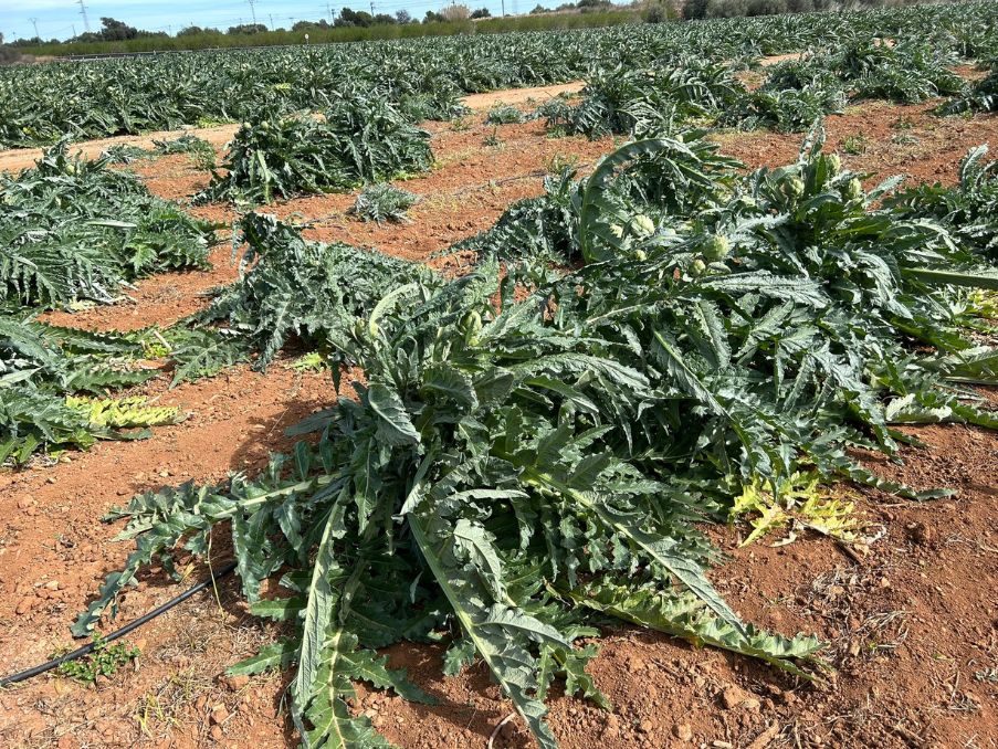 El foco de la preocupación también se ha situado en la alcachofa en varias zonas localizadas. El cultivo, que como la naranja también se encuentra en plena recolección, alcanza el máximo peso sobre la rama, lo cual lo hace más vulnerable a roturas de plantas debido al viento.