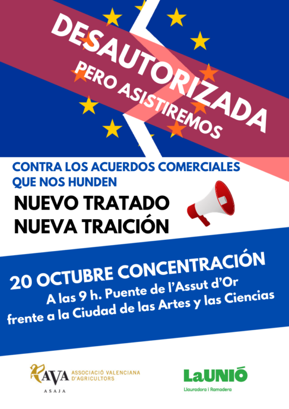 La Asociación Valenciana de Agricultores (AVA-Asaja) y La Unió Llauradora i Ramadera acusan al Gobierno español de desautorizar su concentración de mañana ante la cumbre de los ministros de comercio de la Unión Europea, en Valencia, para “tratar de silenciar los graves problemas del sector agrario valenciano que están provocando los acuerdos comerciales con países terceros de los que el propio Gobierno es cómplice e incluso promotor en el caso del tratado con Mercosur”.