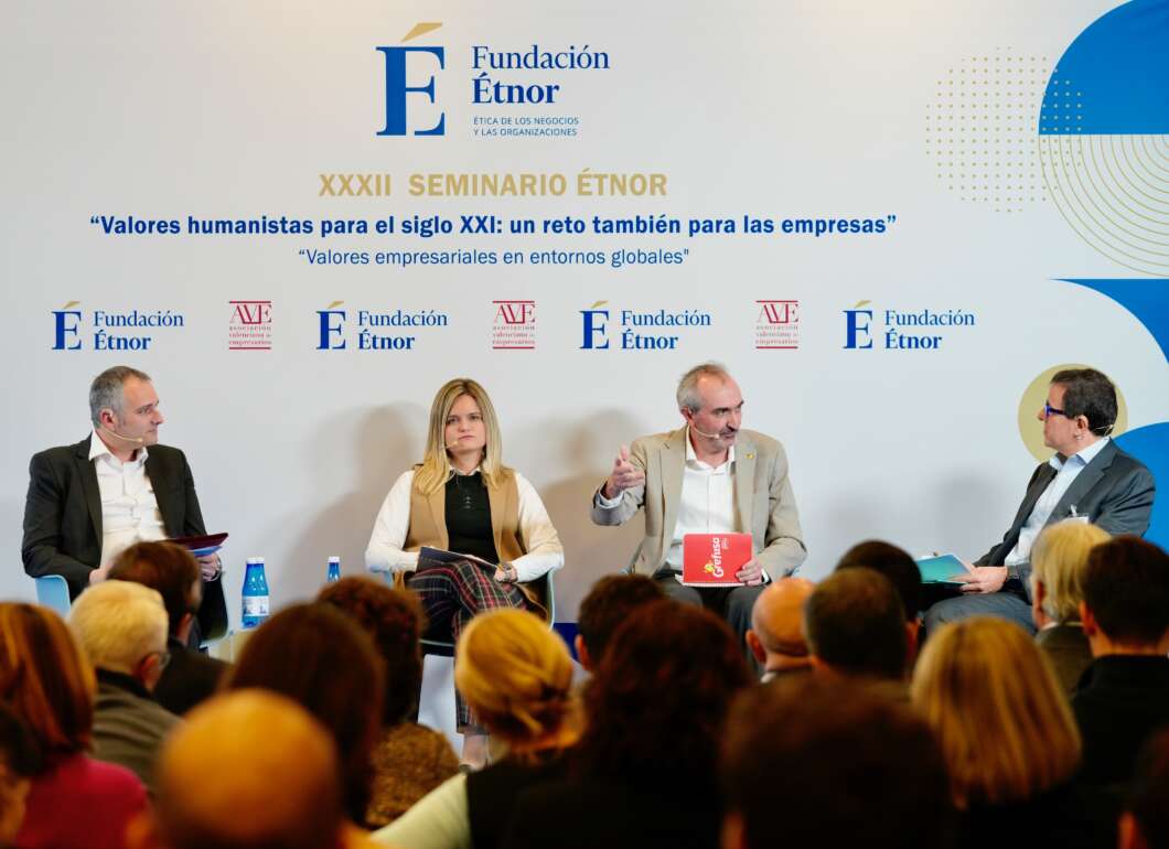 Valores como la transparencia, la escucha activa, la cercanía, la honestidad, el respeto, la superación, la adaptación, la excelencia y la innovación son fundamentales para el éxito de las empresas y su perdurabilidad en el tiempo. Así se ha puesto de manifiesto en la mesa de debate “Valores empresariales en entornos globales” organizada por la Fundación Étnor y la Asociación Valenciana de Empresarios (AVE) en el marco del XXXII Seminario Permanente de Ética Económica y Empresarial de Étnor “Valores humanistas para el siglo XXI: un reto también para las empresas”.
