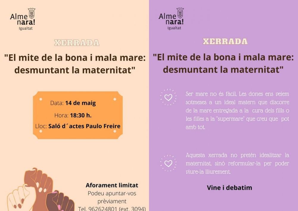 El Ayuntamiento de Almenara a través de la Concejalía de Igualdad ha programado para esta tarde a las 18.30 h, en el salón de actos del edificio municipal Paulo Freire, la charla "El mito de la buena y mala madre: desmontando la maternidad" a cargo de Fem Acció. Las personas interesadas podrán acudir al Salón hasta completar el aforo permitido. Además se cumplirán las normativas sanitarias vigentes.