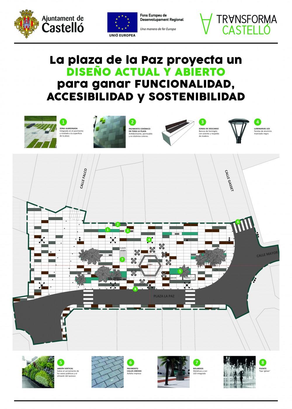 “La plaza de la Paz será más verde, más accesible, humana y europea”, explica Marco. La rehabilitación implementará en la plaza un diseño “más actual y abierto”, ha avanzado López, con un amplio protagonismo de la cerámica, que se utilizará para todo el pavimento “y con el que queremos dar uniformidad a la plaza y alrededores desde el punto de vista estético”. “La apuesta por la cerámica en los usos urbanos es además una reivindicación de este sector industrial clave que queremos tener en cuenta, y además al tratarse de un producto de kilómetro cero, lleva implícito un beneficio ambiental”, ha añadido la alcaldesa.