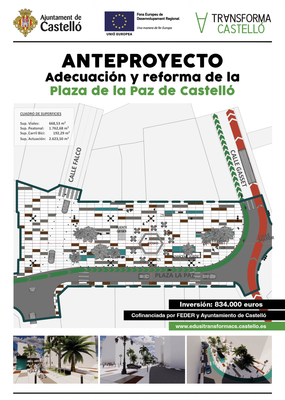 La adecuación y reforma de esta plaza es una de las actuaciones incluidas en la Estratrègia de Desarrollo Urbà Sostenible e Integrado, EDUSI-Transforma Castelló. Marco ha recordado que la capital ha ejecutado ya el 74% de la inversión global de EDUSI, de 20,2 millones de euros. “La previsión es llegar al 100% de ejecución de proyectos en diciembre de 2022, convirtiéndonos posiblemente en el único ayuntamiento de España a conseguir este porcentaje”, ha concluido la alcaldesa. Por lo que la reforma de la plaza de la Paz debería estar acabada como máximo el 31 de diciembre de 2022.