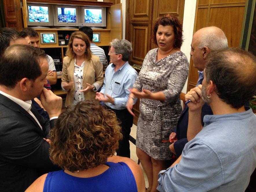 Por las ‘movidas’ y reuniones previas al inicio oficial de la sesión. En el salón de plenos, Toni Lorenzo, Javier Moliner y Vicent Sales; en la antesala, portavoces oficiales y adjuntos de los cuatro grupos, para diseñar la estrategia de una sesión en la que tocaba ‘pegarse’ pero poco, a tenor de las circunstancias personales de la alcaldesa.