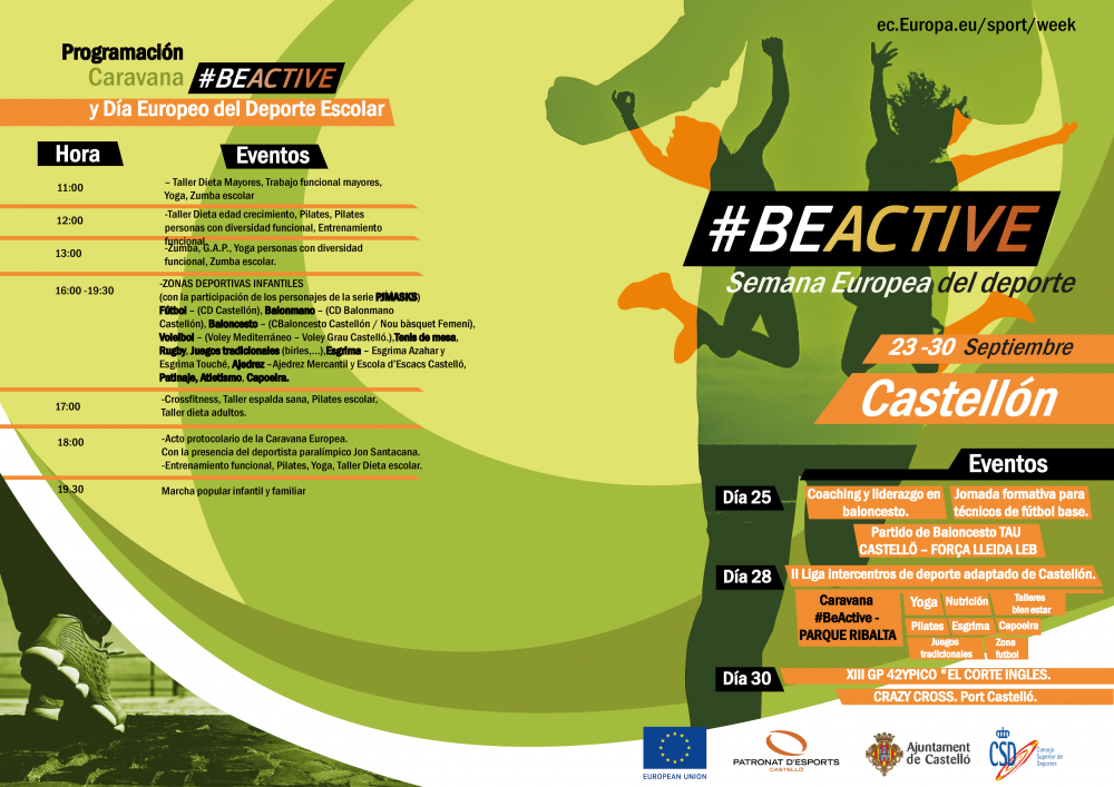 A las seis se recibirá a la caravana #BeActive, que tras pasar por diferentes ciudades de la geografía española llega a Castellón. El medallista paralímpico Jon Santacana hará entrega de la antorcha que simbólicamente representa los valores del deporte. La jornada se cerrará con una carrera popular alrededor del parque pensada para que puedan participar personas de todas las edades.