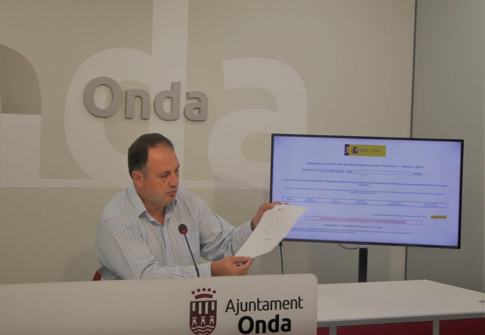 El teniente de alcalde del área de Hacienda y Empleo de Onda, Salvador Aguilella, en un ejercicio de transparencia ha hecho público esta mañana el informe de intervención del segundo trimestre de 2019 del Ayuntamiento de Onda que desvela, según los datos contables a 30 de junio, un déficit en las arcas municipales de 3.351.486,35 euros. Según Aguilella, "este documento demuestra que el anterior Gobierno incumplió el objetivo de estabilidad presupuestaria, dejando al Ayuntamiento en una grave situación económica que desencadena en una necesidad de financiación extra".