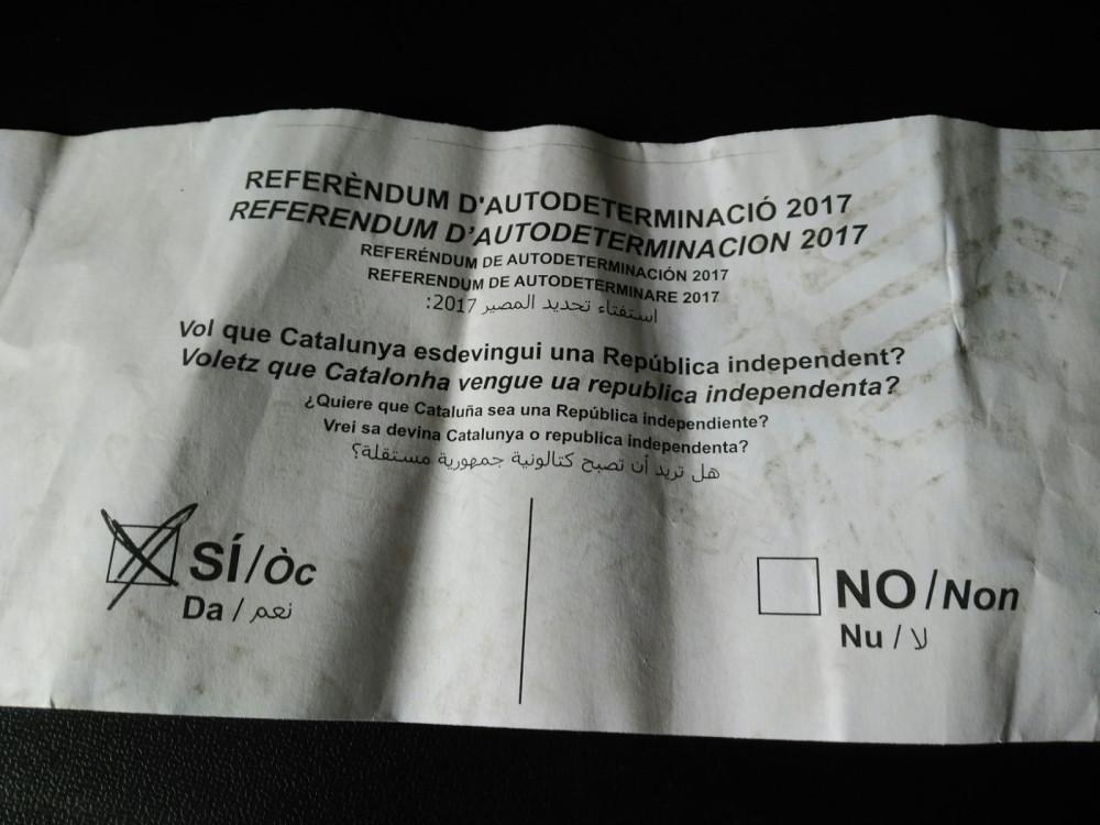 Sin embargo, cuando había cerca de 500 personas en la plaza mayor, un par de individuos han salido a la azotea del Ayuntamiento de Castellón y han colocado una pancarta en la que se podía leer "duiuen democràcia i no ho és" junto al logotipo de BAF (Brigada Antifeixista) y, acto seguido, han lanzado sobre el cielo de Castellón un mar de papeletas que eran una reproducción de las que se emplearán mañana durante el referéndum independentista.