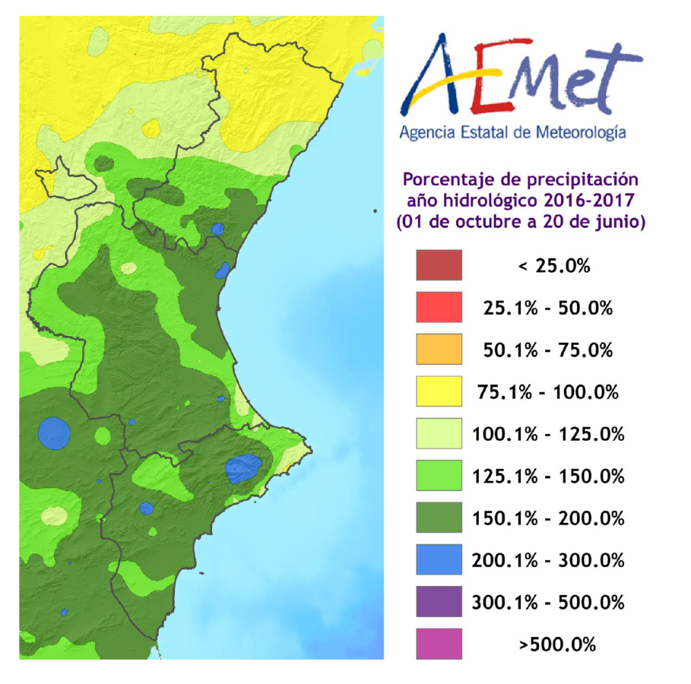 La precipitación media en estas casi tres cuartas partes de año hidrológico en la Comunitat Valenciana (desde el 1 de octubre de 2016 y hasta el 20 de junio de 2017) es de 585.1 l/m², que es un 40% superior al promedio climático normal (415.1 l/m²). Los grandes temporales de Levante invernales, más el temporal de marzo, convierten a este año hidrológico como el más húmedo desde el año hidrológico 1990-1991 y lo califican como muy húmedo.