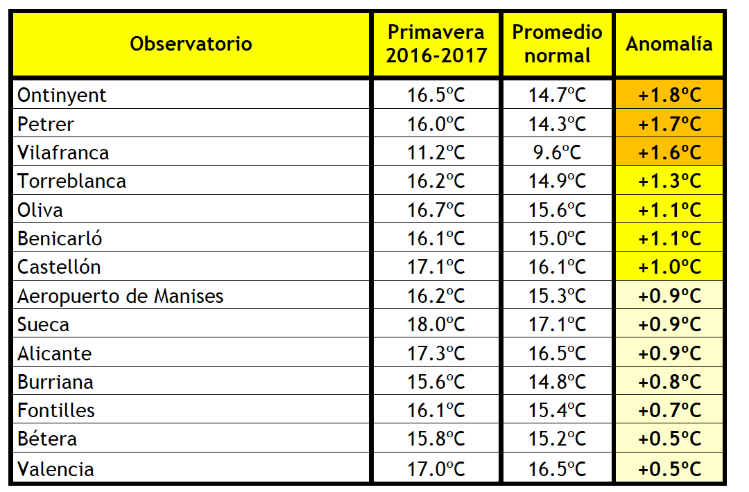 La primavera 2017 (meses de marzo, abril y mayo) ha sido muy cálida y pluviométricamente normal en la Comunidad Valenciana. La temperatura media ha sido 14.7ºC que es 1.1ºC más alta que la del promedio normal (13.6ºC), y califican al trimestre como muy cálido, y la precipitación media, 112.4 l/m2, es un 15% inferior a la del promedio climático del periodo 1981-2010 (130.9 l/m2), y califican al trimestre como pluviométricamente normal