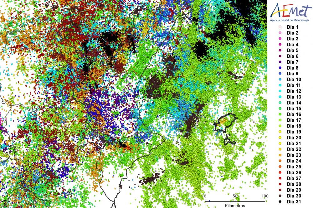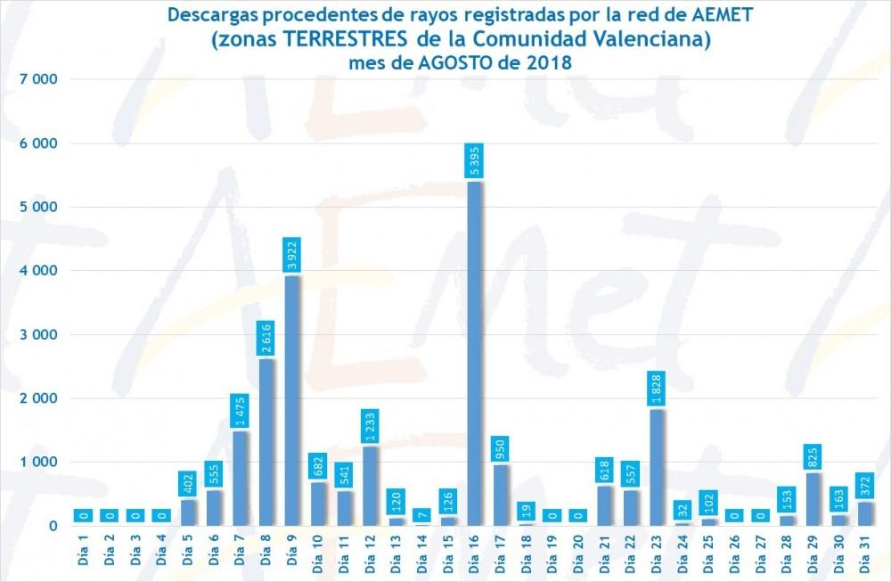 rayos_diaCVALEn cuanto a la precipitación, destacan las tormentas, que si bien es cierto que tuvieron corta duración y estuvieron no muy organizadas, fueron muy numerosas (en total hubo 23 días de tormenta en todo el mes), y dejaron muchos rayos (más de 22.000 descargas impactaron dentro del territorio de la Comunidad Valenciana, el valor más alto en agosto desde 2003), y localmente tuvieron intensidad muy fuerte o torrencial, estuvieron acompañadas de granizo y provocaron fuertes rachas de viento. Adjunto mapa con los rayos registrados en el mes y el número de descargas que han impactado día a día dentro del territorio de la Comunidad Valenciana. Estos gráficos no están incluidos en el resumen.