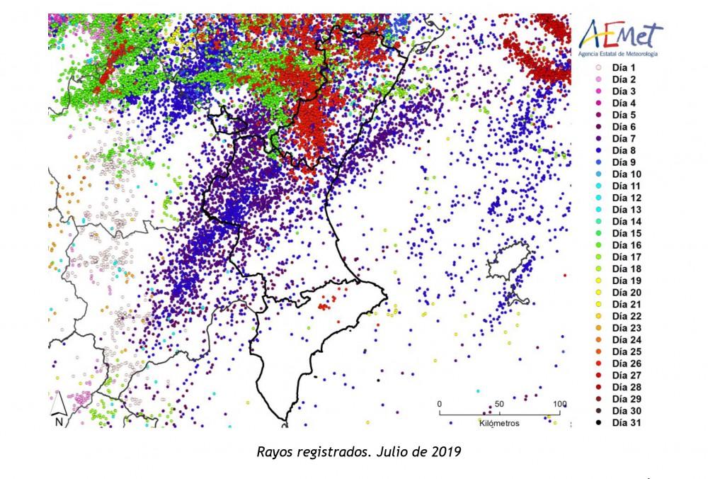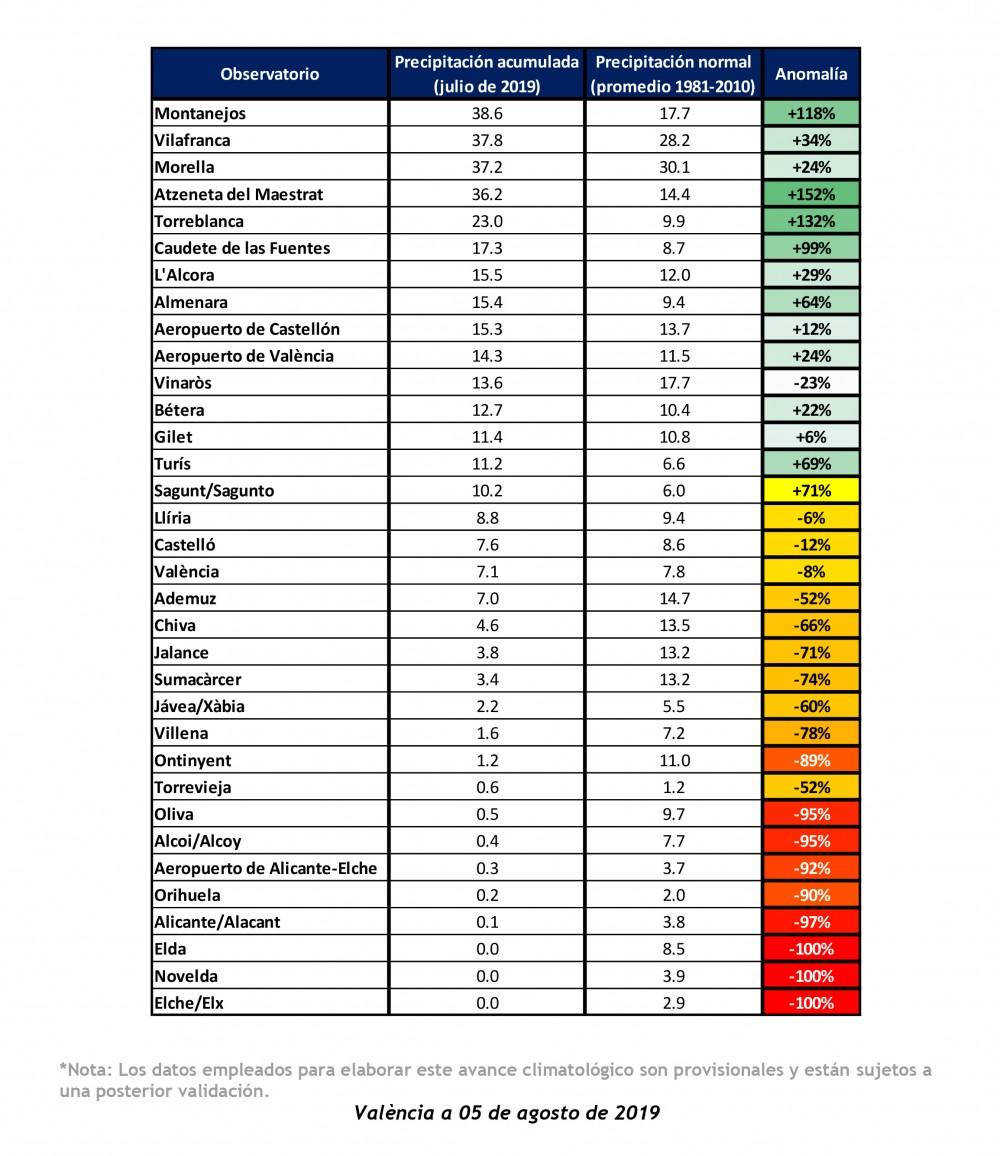 En cualquier caso, en la climatología de la Comunidad Valenciana, julio es el mes más seco en casi el 100% del territorio, y tanto los déficits como los superávits de precipitación que se puedan registrar en este mes tienen muy poco peso en el balance anual y suele ocurrir también que, a poco que llueva en julio, el mes resulta húmedo.