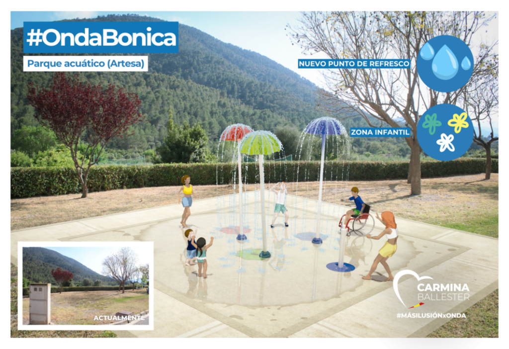 La alcaldesa de Onda y candidata a revalidar el cargo, Carmina Ballester, ha presentado esta mañana el proyecto del nuevo parque acuático en la pedanía de Artesa, que se ubicará en la calle Carles Salvador, así como el resto de propuestas que el equipo ha preparado en respuesta a las demandas de los vecinos. Entre ellas, destaca la adecuación del frontón y entorno así como la reforma del local social.