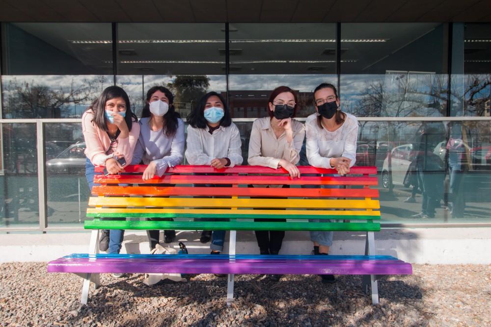 El Màster de la Pau de l'UJI ha pintat un dels bancs de l'edifici de l'Escola de Doctorat i Consell Social amb els colors de la bandera LGTBIQ+