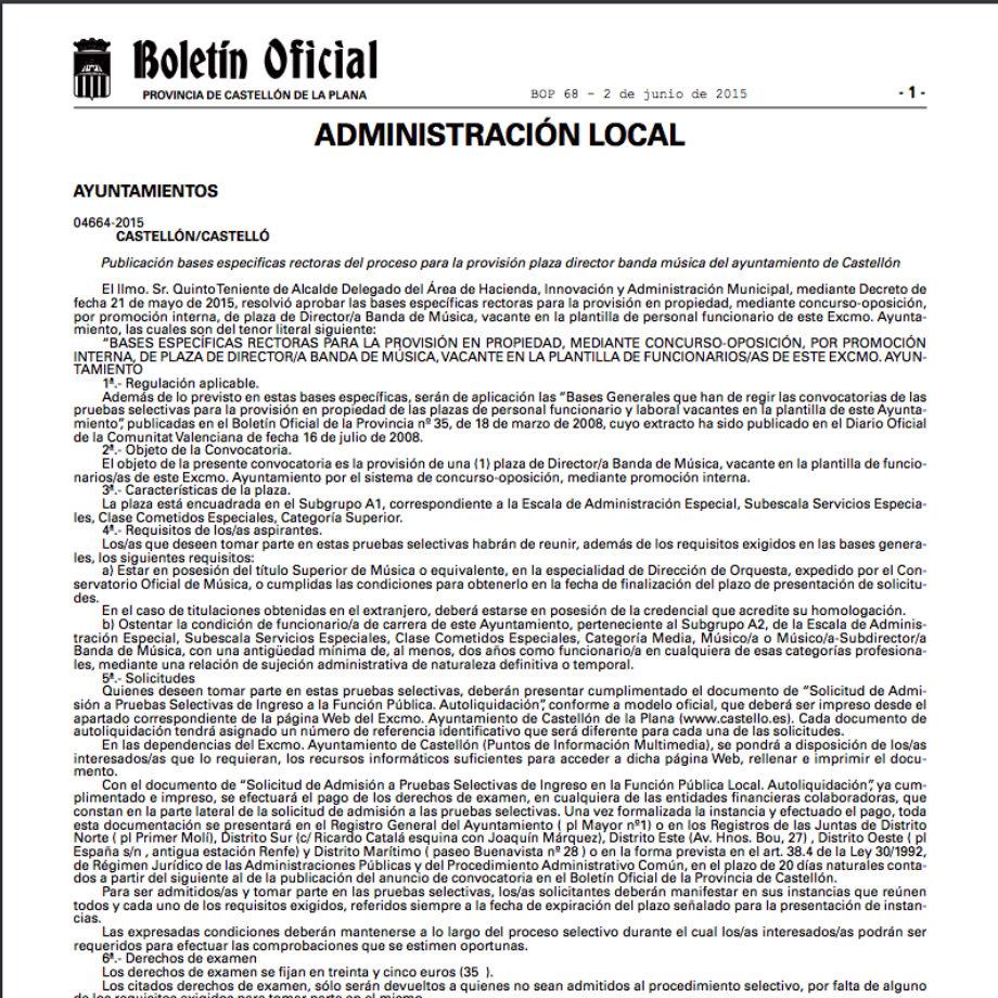 Pero además, el 2 de junio de 2015 se publicaron las bases específicas para poder acceder a la promoción interna de la plaza de director de Música de la Banda Municipal de Castellón. Ver documento completo: BOP CS 020616 plaza director Banda Castellon