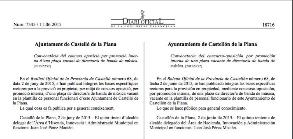Y para mayor información, el Diario Oficial de la Generalitat recogió en fecha de 11 de junio de 2015, el anuncio de la publicación del BOP en relación a las bases específicas en su integridad para la plaza de director de música de la Banda de Castellón, en formato de promoción pública.
