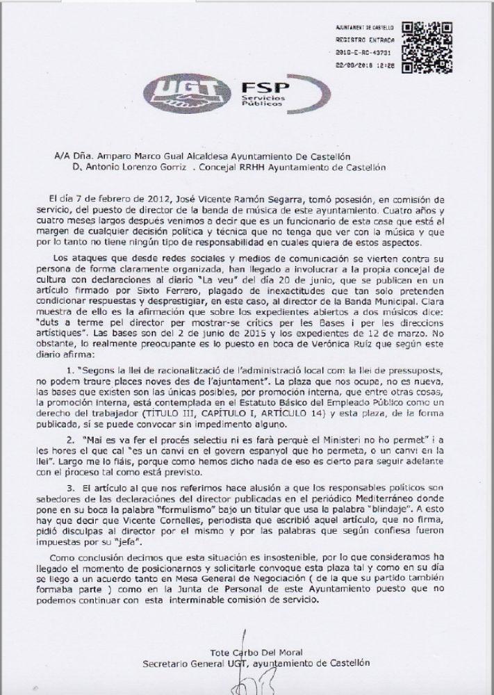 Por parte de UGT, este sindicato registró un comunicado oficial el 22 de junio de 2016, dirigido a la alcaldesa de Castellón y al concejal de Personal, Toni Lorenzo. Aparte de incidir en la polémica y problemas de la Banda, en su último párrafo señala: “Como conclusión decimos que esta situación es insostenible, por lo que consideramos llegado el momento de posicionarnos y solicitarle que convoque esta plaza tal y como en su día se llego a un acuerdo en la Mesa General de Negociación(de la que su partido también formaba parte)como en la Junta de Personal de este Ayuntamiento, puesto que no podemos continuar con esta interminable comisión de Servicio.