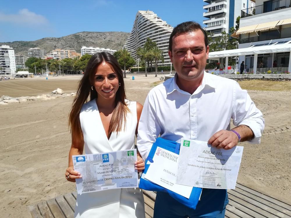 El alcalde de Peñíscola, Andrés Martínez, junto a la recién nombrada concejala delegada del área de Turismo y Playas, Raquel París, han recogido las Banderas Azules para las playas urbanas de la localidad, la Playa Norte y la Playa Sur. El acto de entrega, por parte de la Generalitat Valenciana, ha tenido lugar en Cullera y ha estado presidido por el Secretario Autonómico de Turismo, Francesc Colomer.