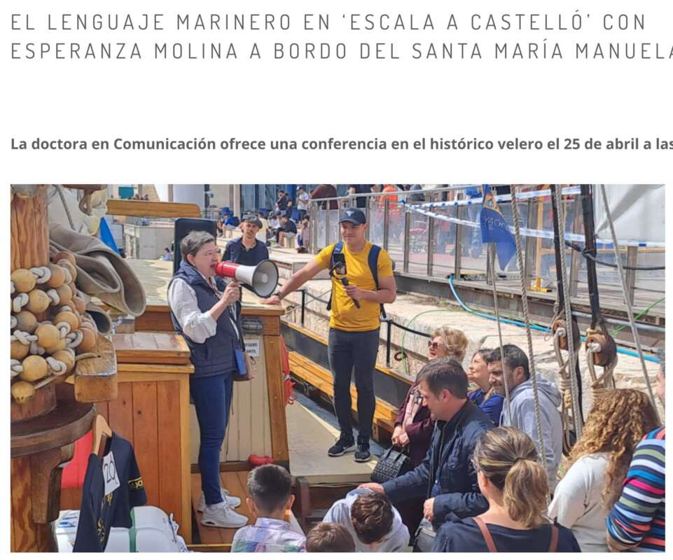 19.00h “El lenguaje marinero en nuestras vidas”. Charla de Esperanza Molina (Miembro de ADComunica y Doctora en Comunicación) en la cubierta del Santa María Manuela (Muelle de Levante). Actividad organizada en colaboración con Adcomunica y El Corte Inglés