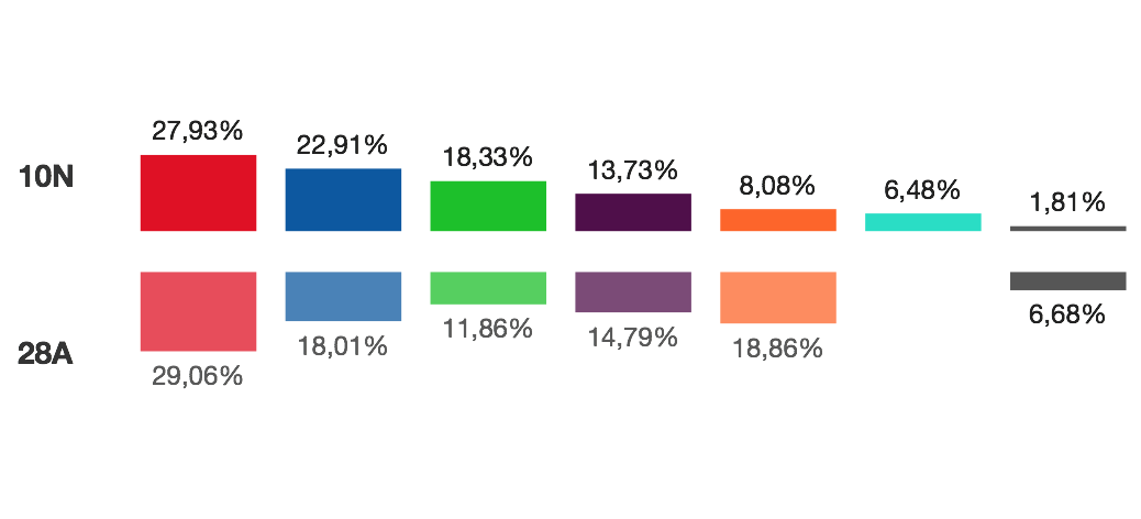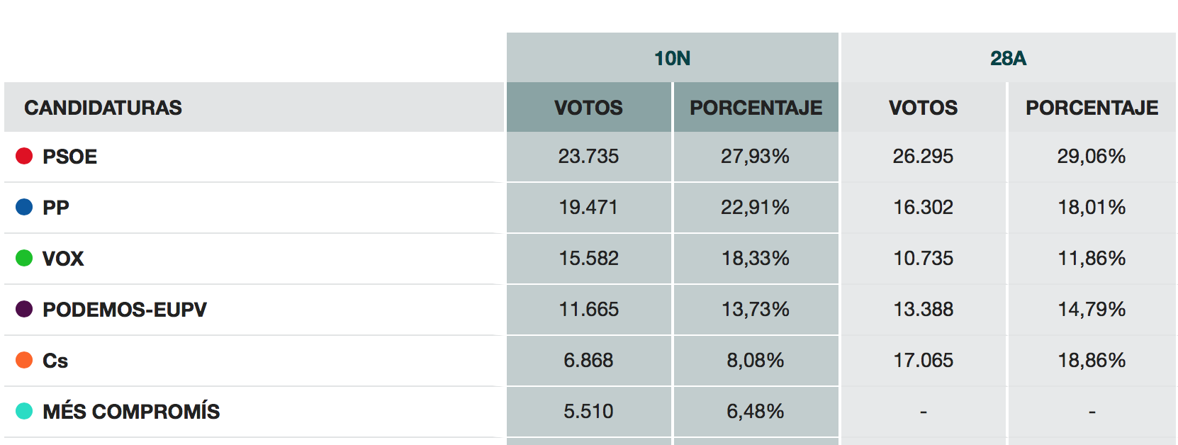 Los socialistas han obtenido un 27,93% de los votos frente al 29,06% del 28A (2.560 votos menos), el PP un 22,91% frente al 18,01 de los pasados comicios, 3.169 más, Vox ha subido 4.847 votos, pasando de 11,86% al 13,73%, Podemos ha bajado 1.723, de 14.79% a 13,73% y Cs pasa del 18,86% al 8,08%, 10.197 votos menos.