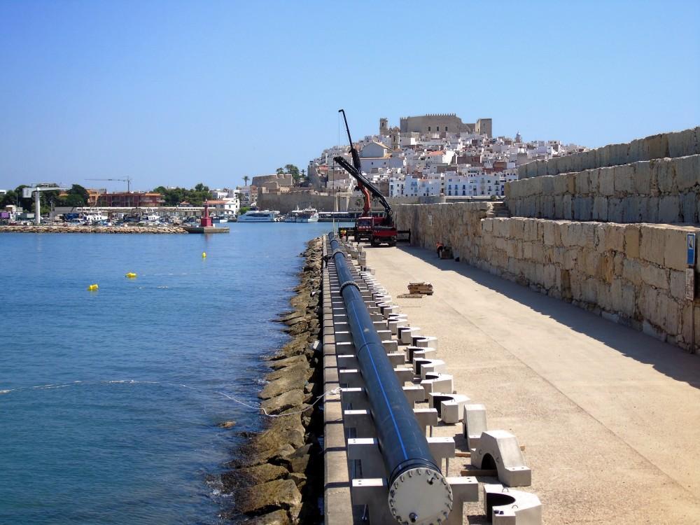 La actuación consiste en la construcción en tierra de los tramos de tubería de PEAD 710 mm en las instalaciones del puerto de Peñíscola, añadiéndose posteriormente los lastres de hormigón. Este conjunto de tubería y lastres será lanzado al mar y mantenida la flotabilidad del conjunto se trasladará hasta el punto de desconexión de la tubería, donde se fondeará el conjunto controladamente hasta su posición, conectándose finalmente a la tubería existente. Para las operaciones marítimas se está utilizando además del equipo de buzos, una embarcación de apoyo para traslado de la tubería, equipada con grúa y bomba de succión para operaciones de dragado del fondo marino.