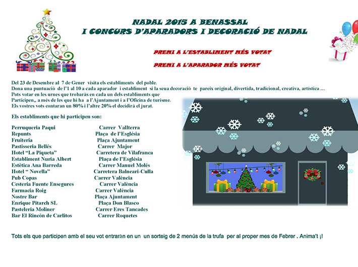 Los comercios de Benasal que se engalanen de manera especial durante esta Navidad pueden tener premio. El Ayuntamiento ha organizado la primera edición del Concurso de Escaparates y Decoración con motivo de estas fechas. Del 23 de diciembre al 7 de enero, los vecinos pueden votar en cada establecimiento comercial, en la Oficina de Turismo y en el Consistorio el escaparate y comercio que les gusta más mediante una papeleta que pueden depositar en las urnas que allí se han dispuesto. Los votos del público suponen un 20% y el jurado decidirá mediante el 20% restante. Así, una vez contabilizados, se entregará un premio al establecimiento más votado y otro al mejor escaparate.