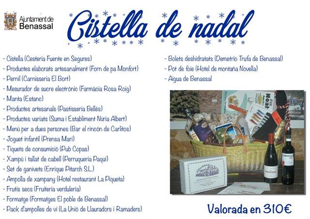 El Ayuntamiento de Benassal con la colaboración de 28 comercios y entidades de la localidad ha puesto en marcha una campaña para fomentar las compras navideñas en las tiendas de proximidad. Para ello se sortearán dos cestas navideñas valoradas en 310€ y 170€ respectivamente.