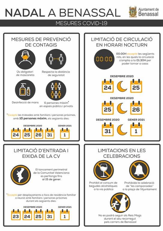 De la mateixa manera, l'Ajuntament de Benassal recorda als veïns i veïnes que, segons la normativa vigent, les reunions poden ser d'un màxim de 6 persones, excepte els dies 24, 25, 26, 31 de desembre i 1 de gener, quan el màxim s'ha ampliat a 10 sempre que siguen familiars o persones pròximes. De la mateixa manera, no es pot oblidar que la limitació de circulació en horari nocturn comença a les 00.00h excepte els dies 24, 25 i 31 quan comença a les 01.30h. El tancament perimetral de la Comunitat Valenciana continuarà fins al 15 de gener, estant permeses les eixides i entrades de la Comunitat els dies 23, 24, 25 i 31 de desembre i 1 de gener per a visitar a familiars i afins.