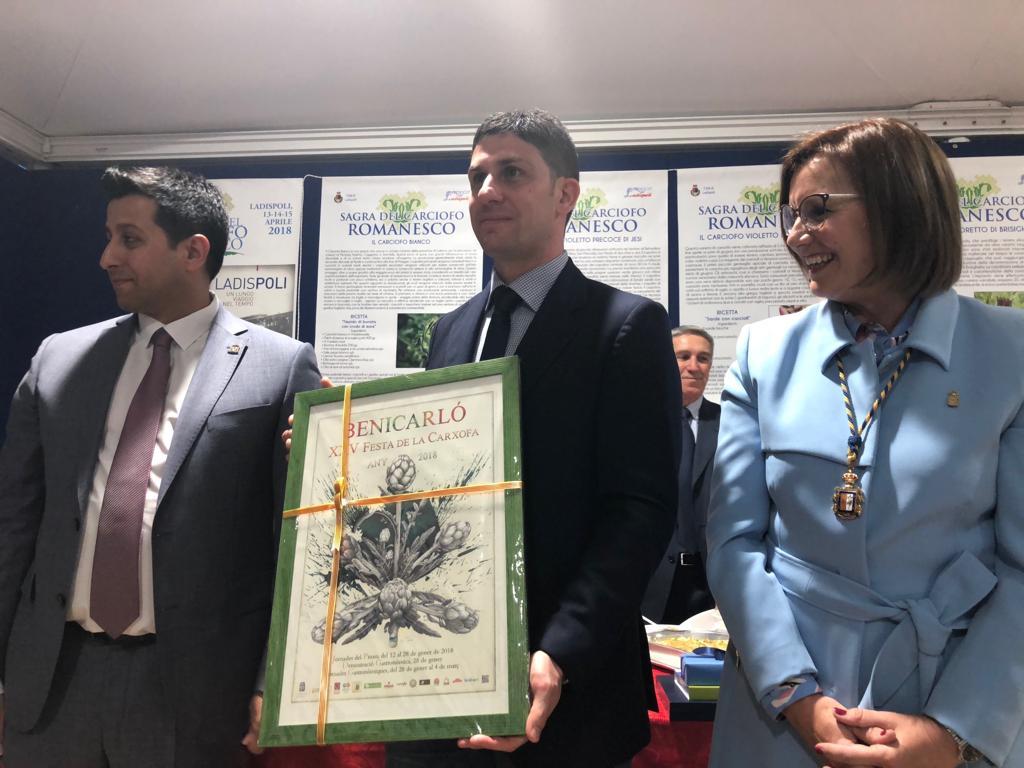 Aprofitant la recepció oficial a la delegació de Benicarló, Xaro Miralles va lliurar a l'alcalde de Ladispoli, Alessandro Grando, una reproducció del cartell de la XXV Festa de la Carxofa, obra de l'artista valencià Manuel Boix, i va convidar a l'alcalde a assistir als actes centrals de la propera edició de la Festa de la Carxofa de Benicarló, que tindran lloc a finals de gener de 2019.