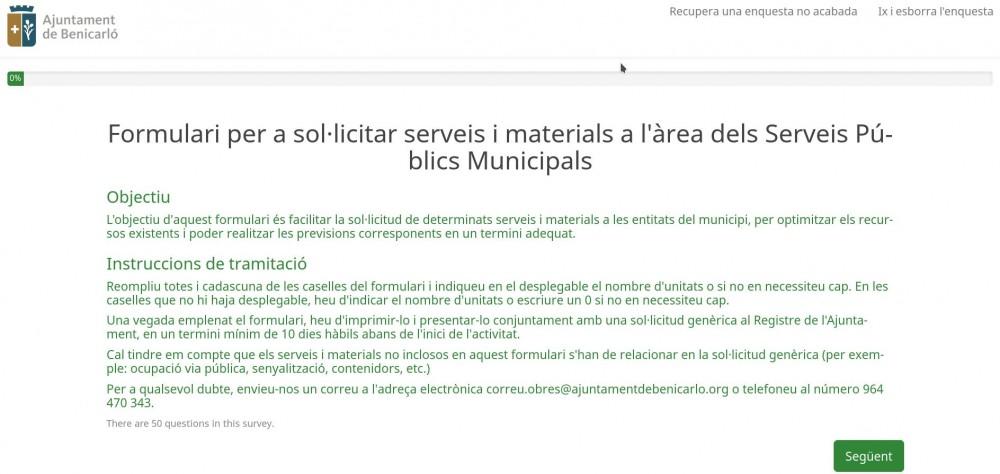 La plataforma permet seleccionar totes les demandes que necessite l'entitat, de manera que arriben directament a la Brigada d'Obres i Serveis. Cal remarcar que, una vegada completat el formulari, l'entitat ha de registrar la petició, ja siga en paper al Registre General de l'Ajuntament o a través del Registre Electrònic Comú (és necessari disposar de DNI electrònic o certificat electrònic en vigor). Aquest punt consisteix en un registre de l'Administració General de l'Estat que permet presentar documents per a la remissió telemàtica a administracions públiques integrades en el sistema.