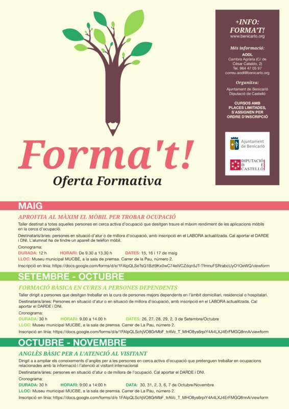 La Regidoria de Promoció Econòmica de l'Ajuntament de Benicarló ha publicat la nova oferta formativa destinada a persones aturades o en situació de millora d'ocupació. De moment, s'ofereixen tres cursos que s'impartiran el proper mes de maig i, posteriorment, a la tardor.