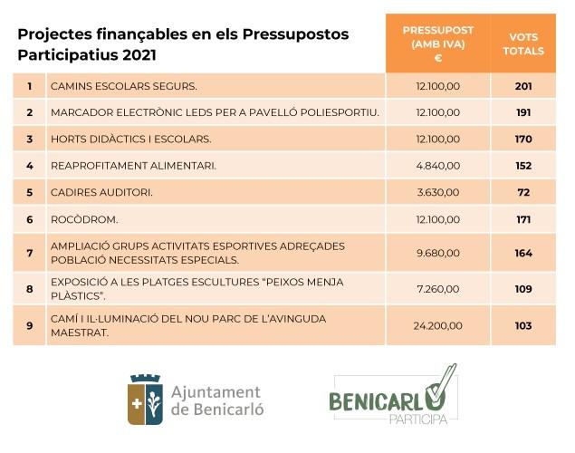 L'Ajuntament de Benicarló executarà un total de 9 projectes a través dels pressupostos participatius 2021. De les propostes més votades per la ciutadania, a les quals es destinaran un total de 100.000 euros, tres actuacions corresponen a l'àmbit esportiu, i la resta es reparteixen entre els àmbits social, comercial, cultural, turístic i urbanístic.