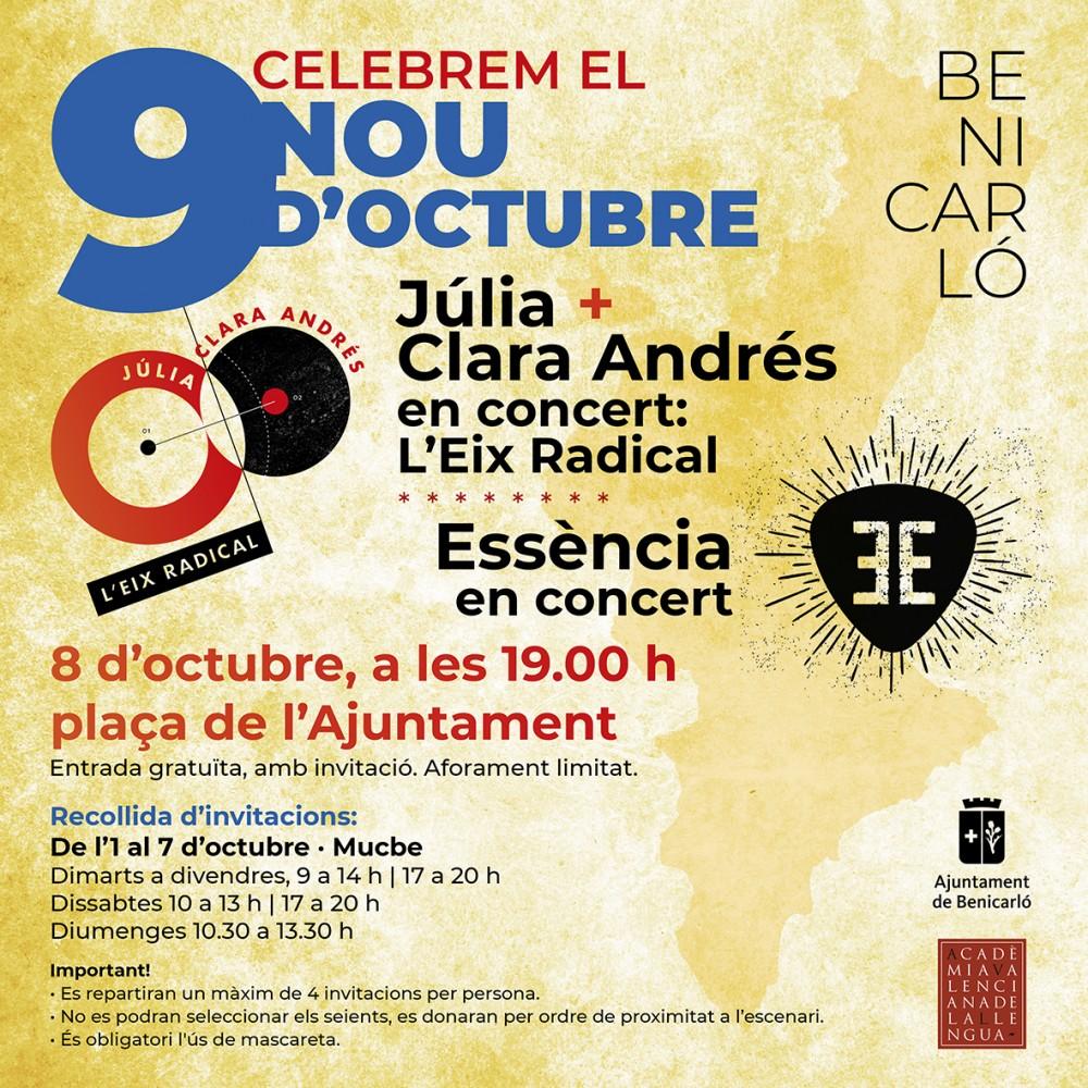La celebració del Nou d'Octubre a Benicarló també estarà marcada per la pandèmia de la Covid-19. Els actes que organitzava cada any l'Ajuntament per a commemorar la festivitat s'han reduït a un concert promogut per Aviva Benicarló que tindrà lloc la vespra, el 8 d'octubre, a la plaça de l'Ajuntament. Els protagonistes seran el grup musical Júlia i la cantautora Clara Andrés, als quals se sumarà la formació comarcal Essència.