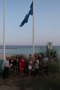 La alcaldesa de Benicàssim, Susana Marqués, junto a la responsable del Área de Turismo, Elena Llobell, el responsable de Playas, Clemente Martín y varios concejales del Ayuntamiento de Benicàssim, además de la reina infantil y damas de Benicàssim, han izado las Banderas Azules que acreditan las buenas condiciones de las playas de Benicàssim en lo referente a servicios y calidad.