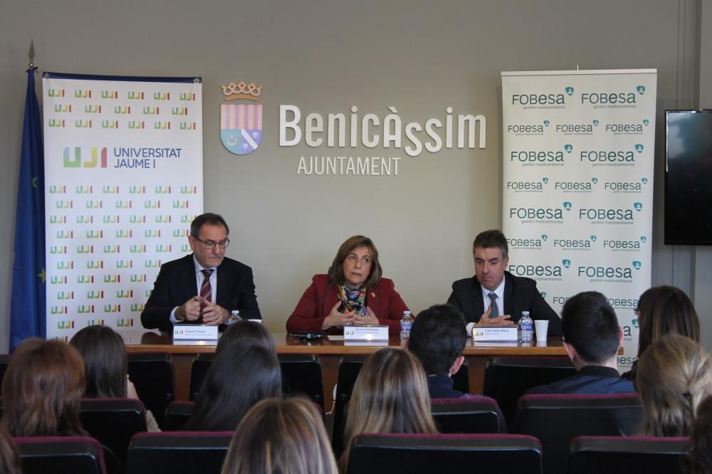 La alcaldesa de Benicàssim, Susana Marqués, junto al rector de la Universitat Jaume I, Vicent Climent y el director general de Fobesa, Juan Pablo Mateo, han entregado hoy las becas 'FOBESA' para los estudiantes de grado de la UJI residentes en Benicàssim en un acto que ha tenido lugar al consistorio benicense.